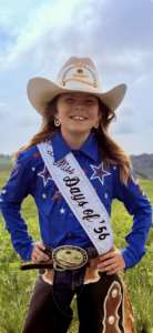 Rita Robinson, Lil Miss Days of 56. I owned a stick horse named Rose. It was a gift from my mom. My first rodeo I attended was days of 56 in Ponca as a baby with my family. My favorite candy bar is Milky Way. My favorite barrel racer is Hailey Kinsel. I love her horse, Sister. My dream horse trailer would have a huge tack area and room for all our horses. My favorite western piece of clothing is a belt buckle because it is pretty.