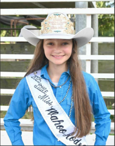 Ada Robinson Hoot Gibson Memorial Rodeo Princess. I owned a stick horse named uni- it was a unicorn. It was a gift from my mom. My first rodeo I attended was days of 56 in Ponca as a baby with my family. My favorite candy bar is Kit Kat. My favorite barrel racer is Tricia Aldridge and I love her horse Audios Pantelones. My dream horse trailer would have bunks for the whole family. My favorite western piece of clothing is a hat because they are fun to wear and match to my outfit.