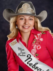 Dakota Glasshoff, Miss Teen Rodeo Nebraska 2025, enjoys spending time around horses and rodeo events. She owns three stick horses named Chocolate, Blacky, and Cupcake, which were a special gift from her Grandma and Papa. Dakota attended her first rodeo at just three years old when her Grandma and Aunt Brooke took her to the Buffalo Bill Rodeo during Nebraskaland Days. That experience helped spark her love for the rodeo lifestyle. Her favorite candy bar is a Hershey’s chocolate bar, and her favorite barrel racer is Hailey Kinsel, whom she admires greatly and has had the opportunity to meet three times. Dakota’s dream horse trailer would include a large bathroom where she could get ready for rodeo events. One of her favorite western fashion pieces is her pearl jewelry collection, which she recently started and enjoys wearing because it goes with everything.